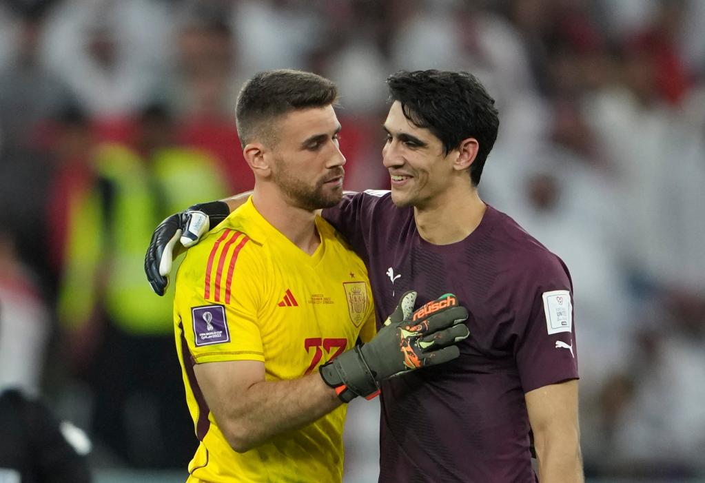 12月6日,西班牙队守门员西蒙(左)与摩洛哥队守门员布努在点球大战前。新华社记者 郑焕松 摄