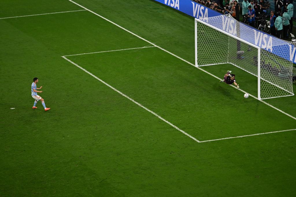 第三轮,贝农延长了助跑距离,射门,球滚向球门左侧,西蒙扑出。