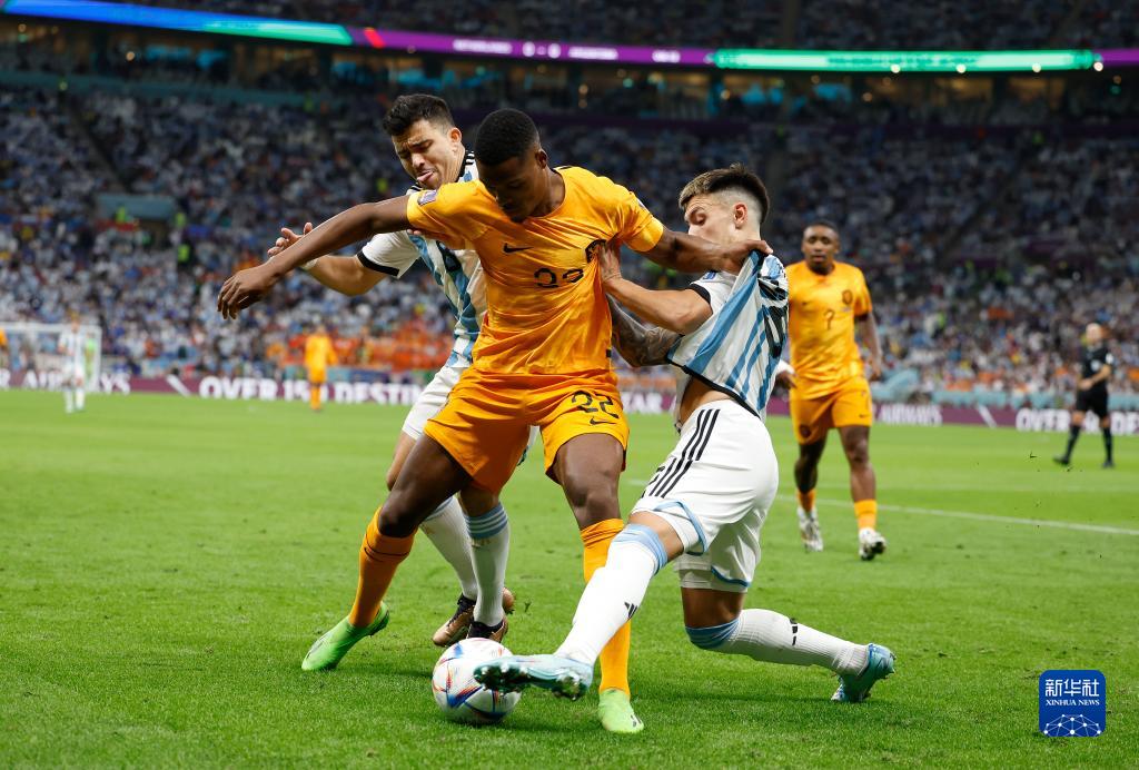 12月9日,荷兰队球员丹泽尔·邓弗里斯(中)与阿根廷队球员利桑德罗·马丁内斯(右)在比赛中拼抢。新华社记者 王丽莉 摄