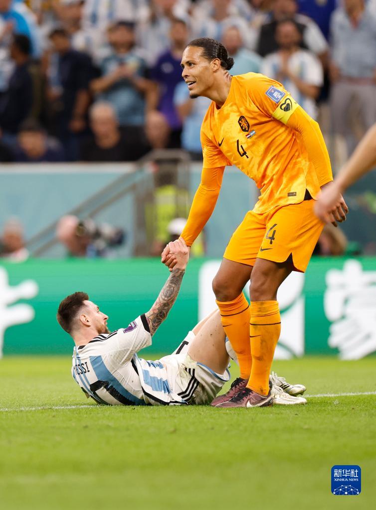 12月9日,荷兰队球员范戴克(上)在比赛中拉起阿根廷队球员梅西。新华社记者 王丽莉 摄