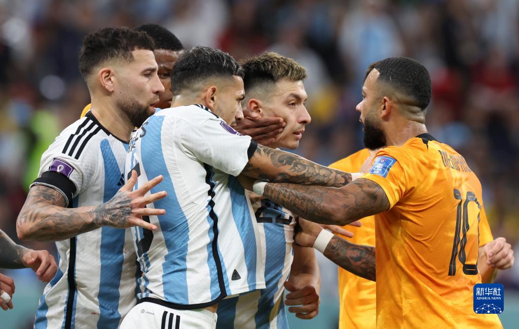 12月9日,荷兰队球员孟菲斯·德佩(右一)在比赛中与阿根廷球员发生争执。新华社记者 曹灿 摄