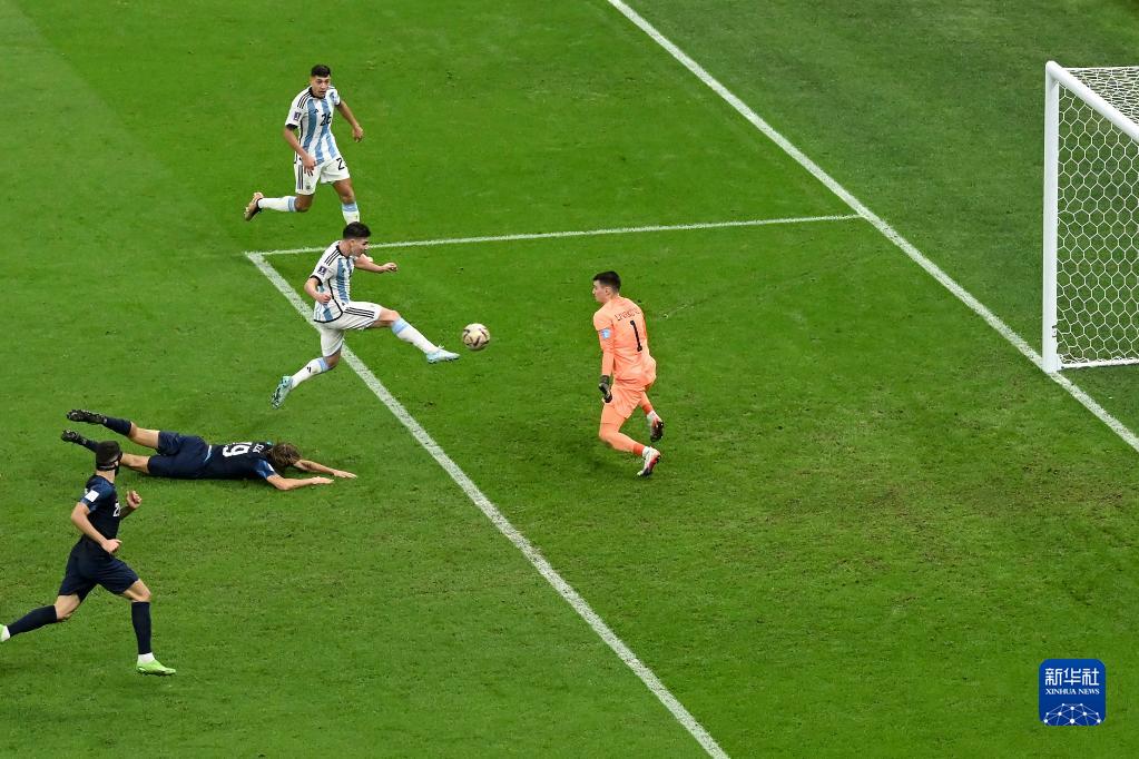 12月13日,阿根廷队球员阿尔瓦雷斯(右二)在比赛中射门得分。新华社记者 肖艺九 摄