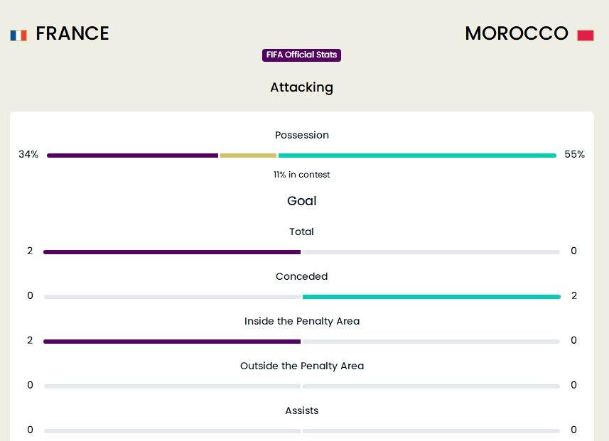 此前五场比赛,他们控球率都大幅低于对手,但却保持不败。小组赛与克罗地亚队第一场,摩洛哥队控球率只有32%,他们与对手互交白卷。与比利时队的第二场,他们控球率依然是32%,他们2:0击败对手。第三场2:1战胜加拿大队的比赛,摩洛哥队控球率为36%。八分之一决赛面对西班牙队,他们控球率只有22%,但120分钟逼平对手后点球大战胜出。四分之一决赛打葡萄牙队,摩洛哥队同样是22%的控球率,1:0拿下胜利。