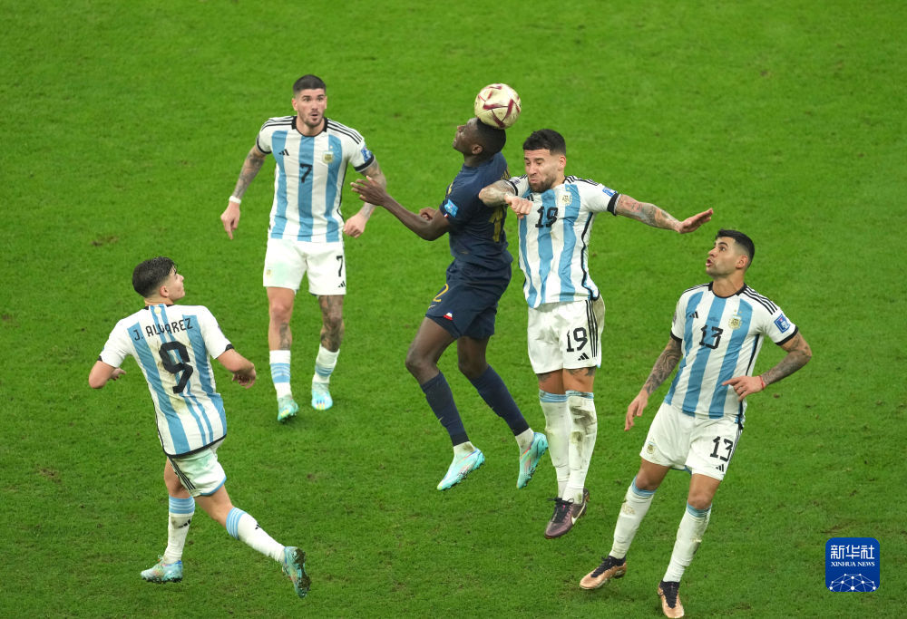 12月18日,法国队球员科洛·穆阿尼(中)与阿根廷队球员奥塔门迪在比赛中争顶。新华社记者 肖艺九 摄