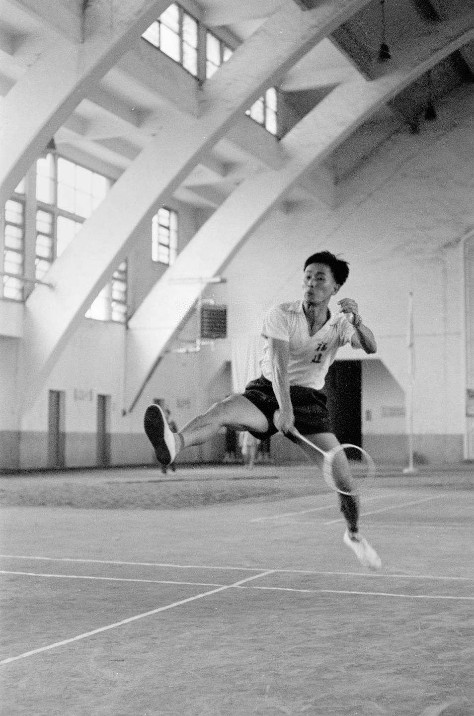王文教在第一届全运会羽毛球男子单打比赛上(资料照片)。新华社记者章梅摄