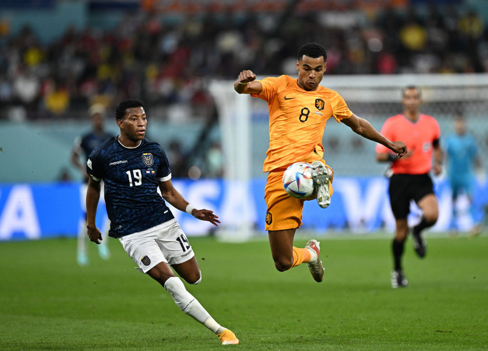 11月25日,荷兰队球员加克波(右)在卡塔尔世界杯比赛中拼抢。新华社记者 辛悦卫 摄