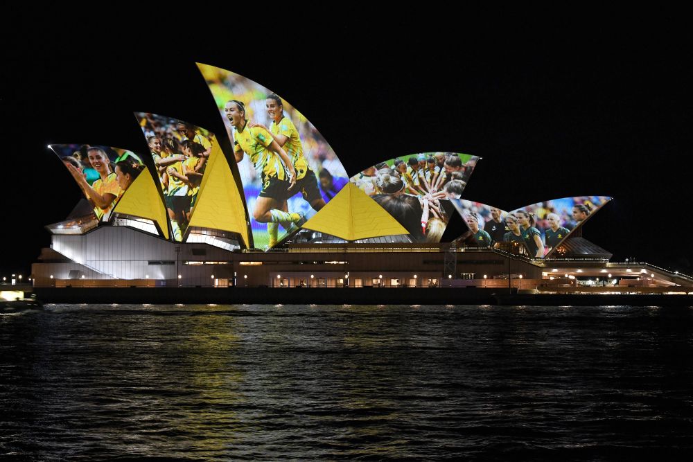 2020年6月25日,澳大利亚悉尼歌剧院外墙打出投影,以庆祝澳大利亚和新西兰获得2023女足世界杯联合举办权。新华社/欧新