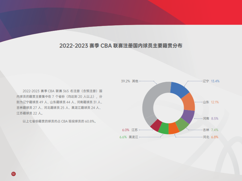 根据白皮书,2022-2023赛季CBA联赛国内球员注册人数相较于前两个赛季有所减少;国内球员的籍贯分布稳定,主要集中在辽宁、山东、河南、吉林、河北、黑龙江、江苏七个省份。此外,白皮书显示,CBA俱乐部青训仍是现阶段CBA联赛最主要的后备力量输送渠道;首次注册CBA联赛的球员人数仍保持稳定增长;休赛期20家俱乐部均有球员的流动,球员交易数量有所下降;《标准合同》签署率达到99.17%,17家俱乐部实现了《标准合同》全覆盖。
