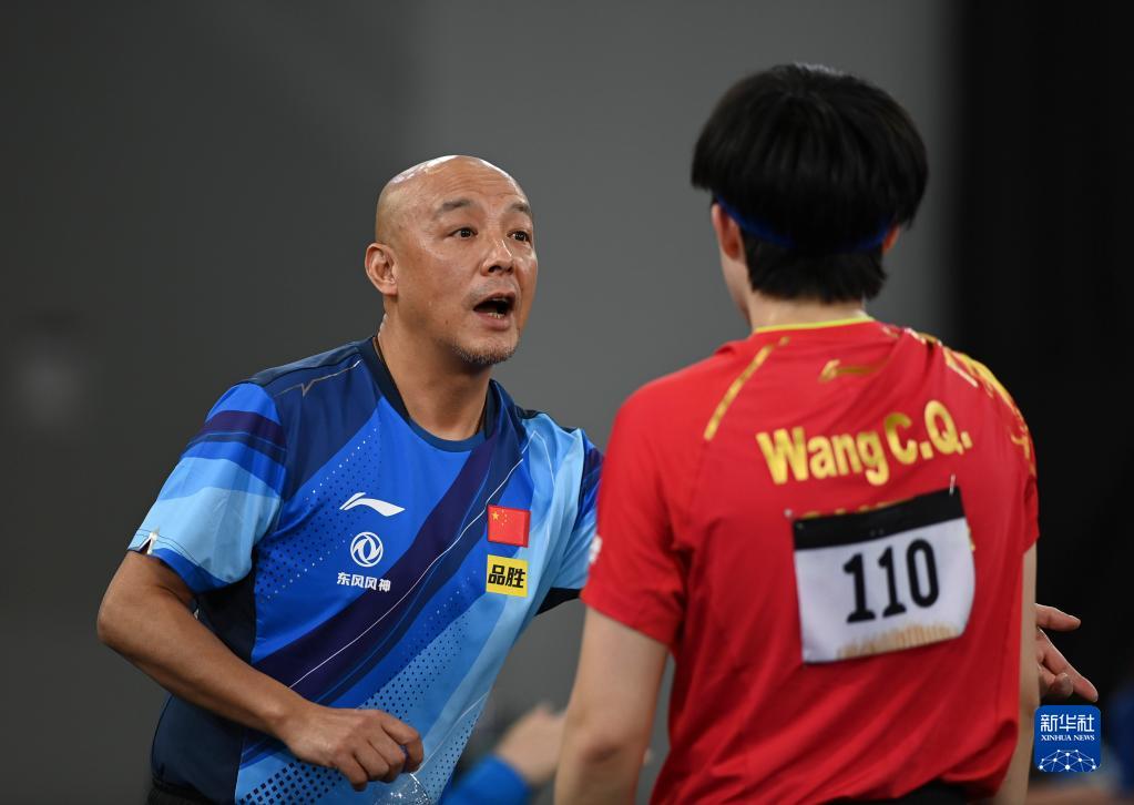 1月10日,教练肖战(左)在比赛中指导王楚钦。新华社发(尼库摄)
