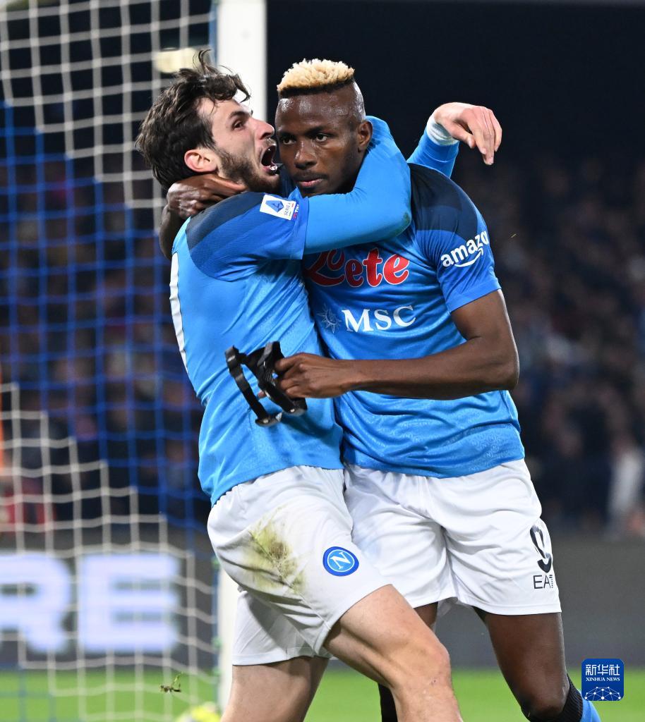 1月13日,那不勒斯队球员奥斯梅恩(右)进球后与队友克瓦拉茨赫利亚庆祝。