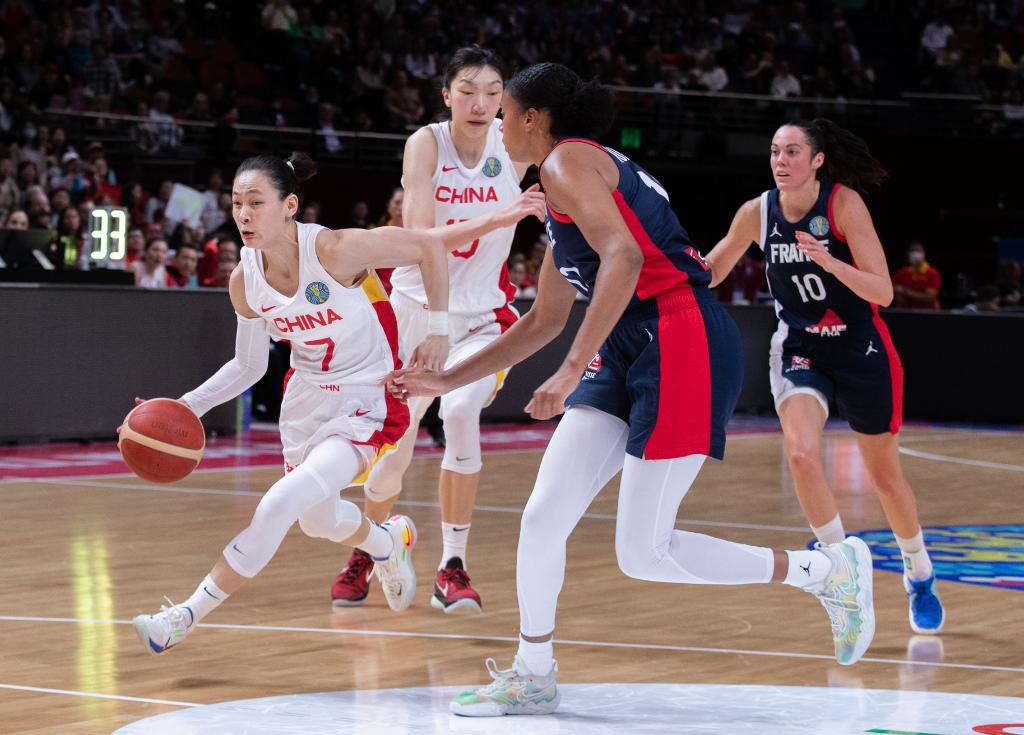 2022年9月29日,中国队球员杨力维(左一)在2022女篮世界杯四分之一决赛对阵法国队的比赛中带球突破。新华社发(胡泾辰摄)