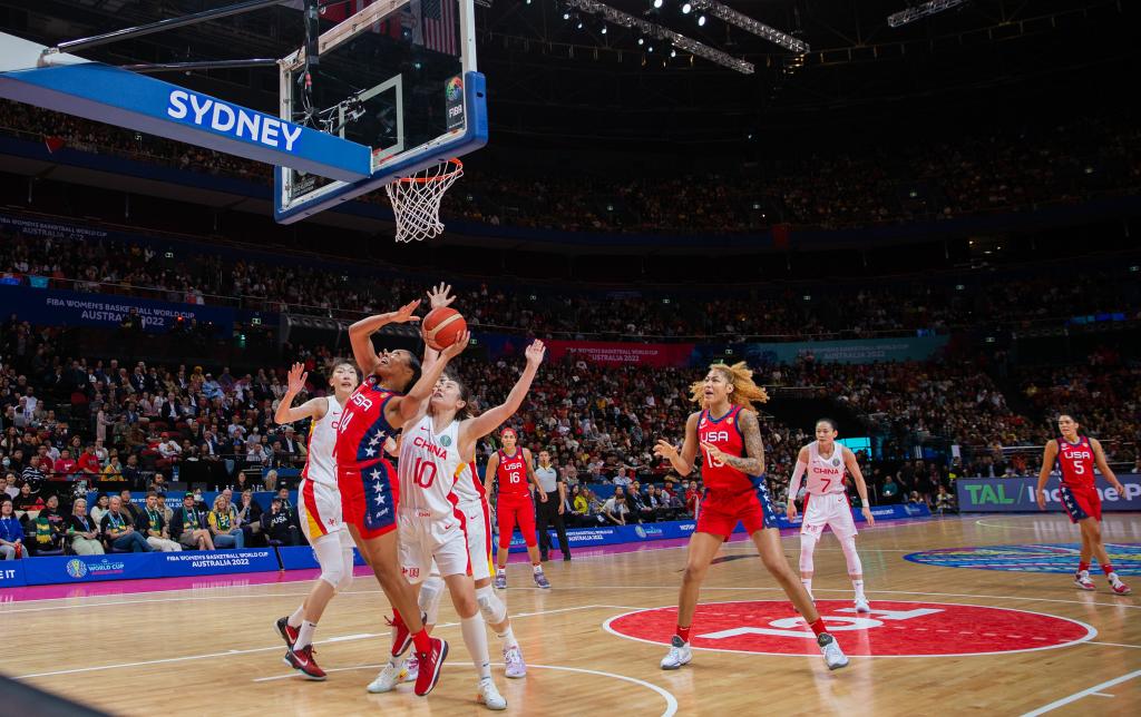 2022年10月1日,美国队球员莱妮(左二)在2022女篮世界杯决赛对阵中国队时上篮。新华社发(胡泾辰摄)
