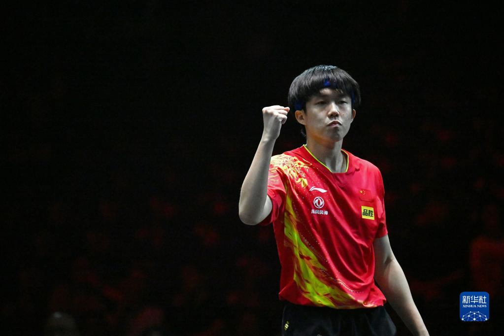 3月15日,中国选手王楚钦在赢得比赛后庆祝胜利。新华社发(邓智炜摄)