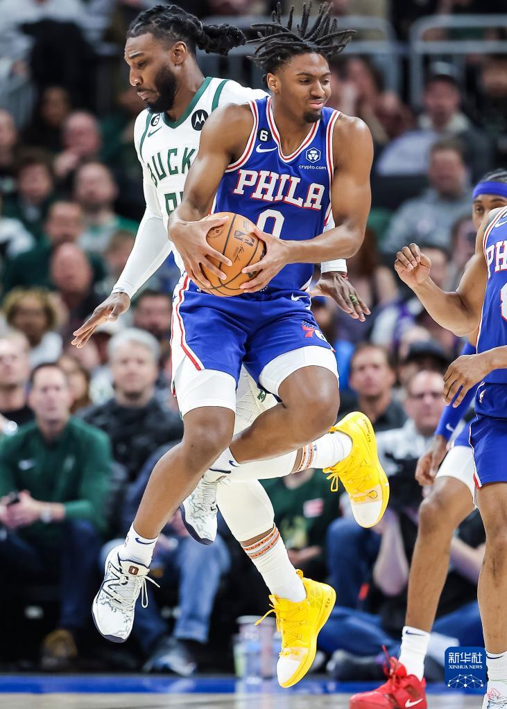 4月2日,76人队球员马克西(前)在与雄鹿队球员克劳德在比赛中拼抢。新华社发(乔尔·莱纳摄)