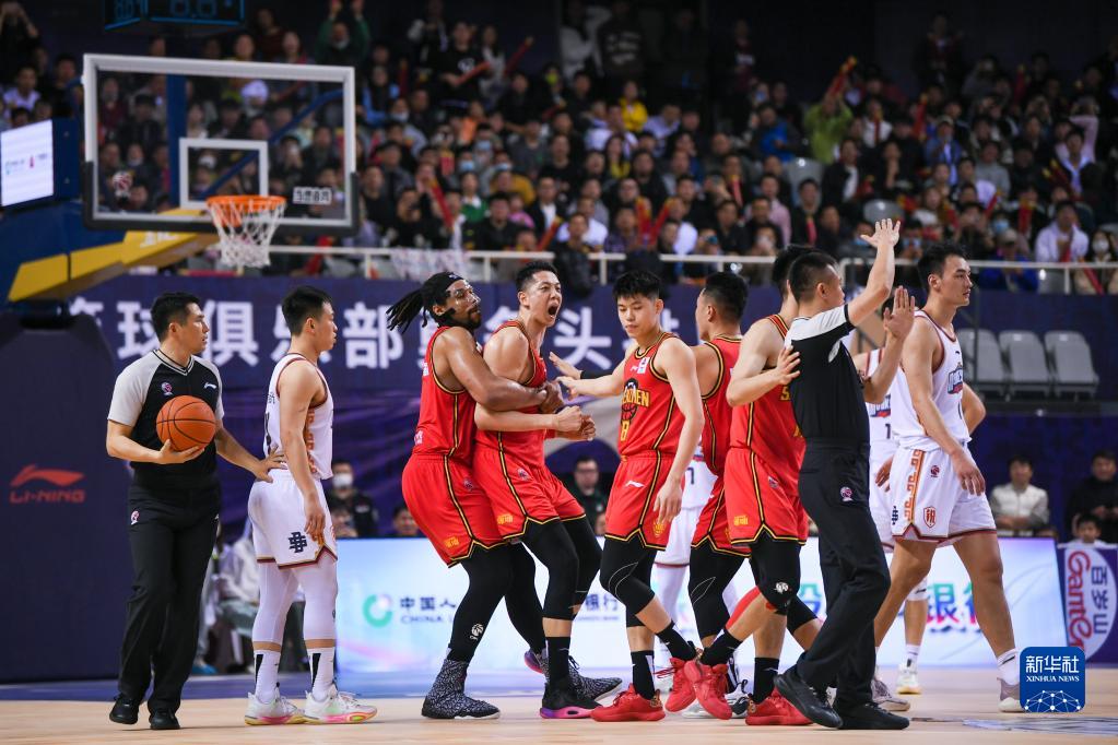 4月3日,深圳马可波罗队球员沈梓捷(左四)在比赛中与裁判理论。新华社记者 李博 摄