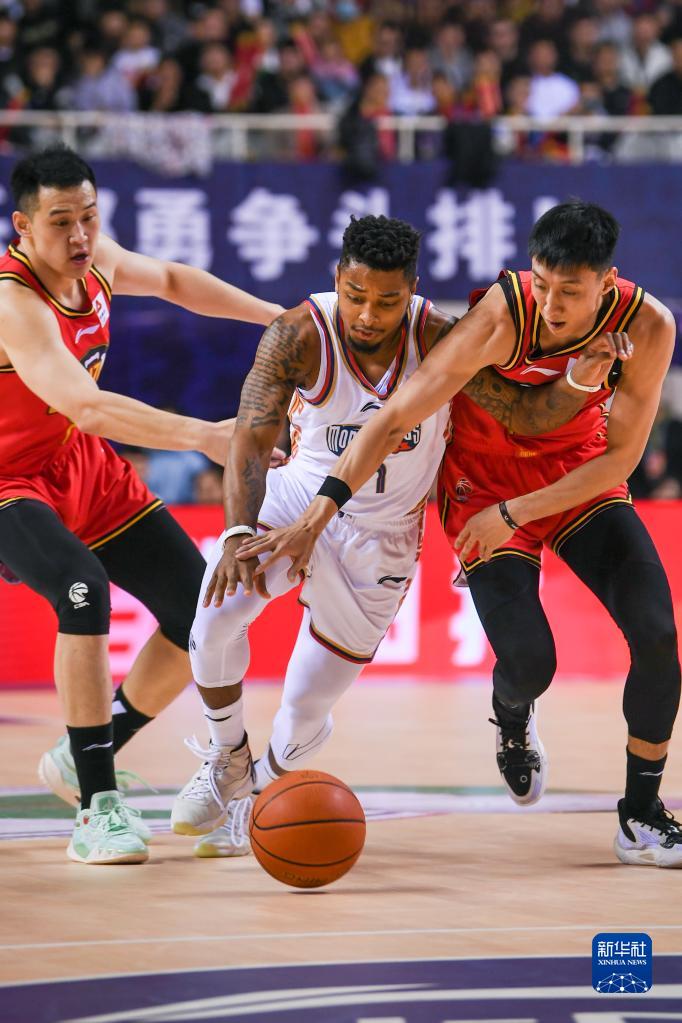 4月3日,南京同曦宙光队球员皮特森(中)在比赛中突破。新华社记者 李博 摄