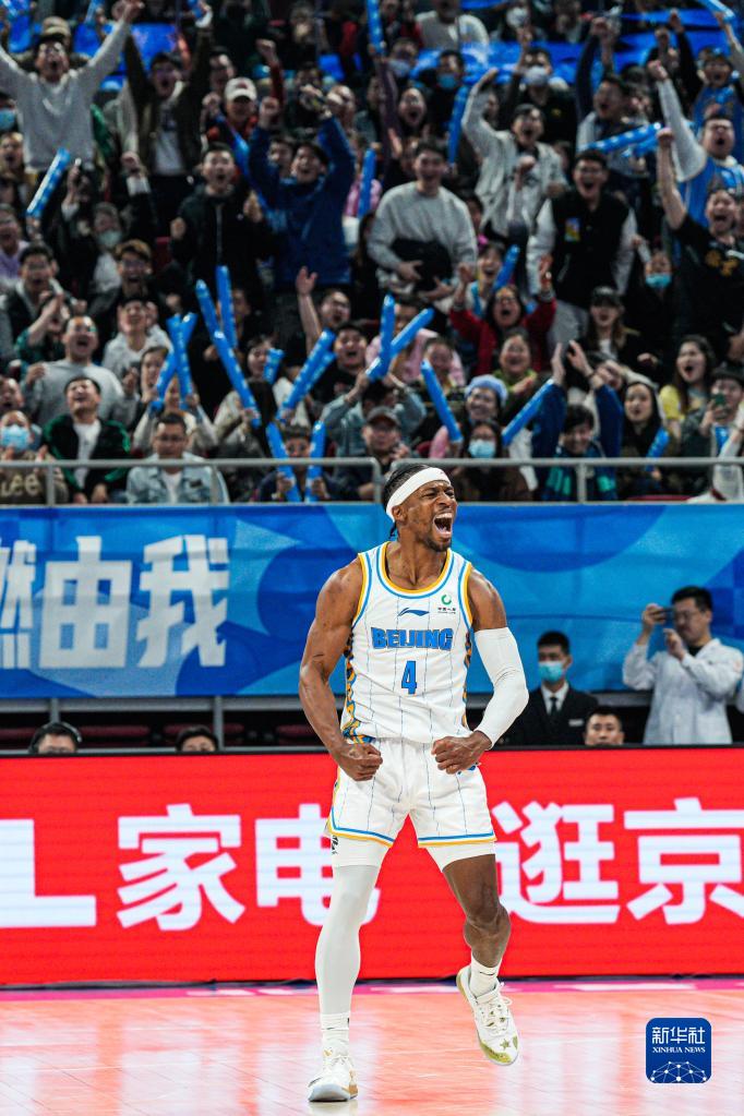 4月5日,北京首钢队球员乔纳森·吉布森在比赛中庆祝得分。新华社记者 吴壮 摄