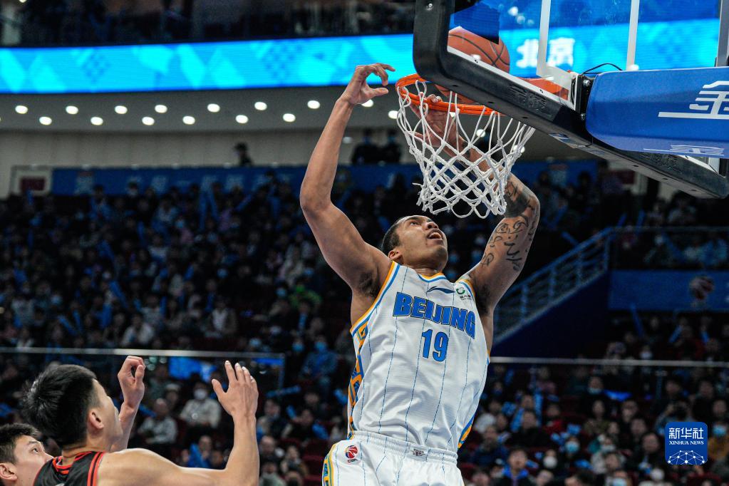 4月5日,北京首钢队球员利夫(右)在比赛中扣篮。新华社记者 吴壮 摄