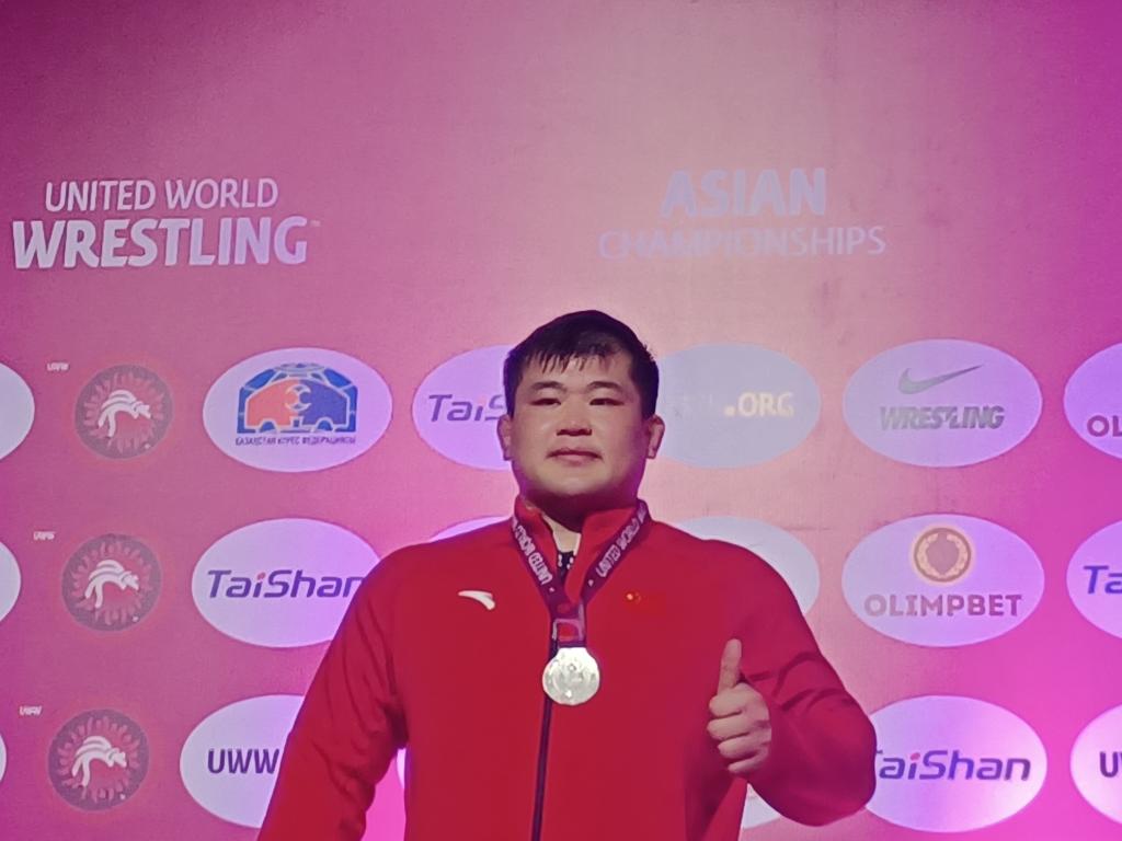 中国队选手孟令哲收获男子古典式摔跤130公斤级银牌