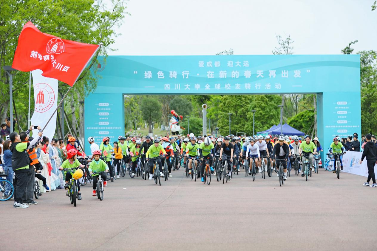 4月22日,成都桂溪生态公园的环城绿道上,正在举行四川大学全球校友骑行活动。