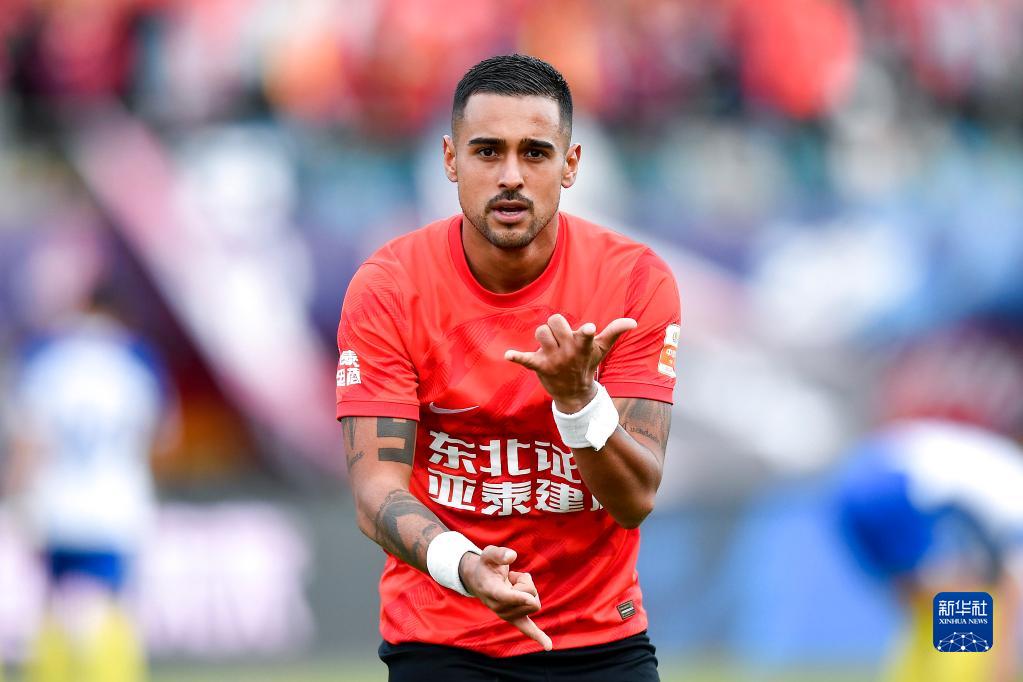 4月30日,长春亚泰队球员莱昂纳多在比赛中庆祝进球。