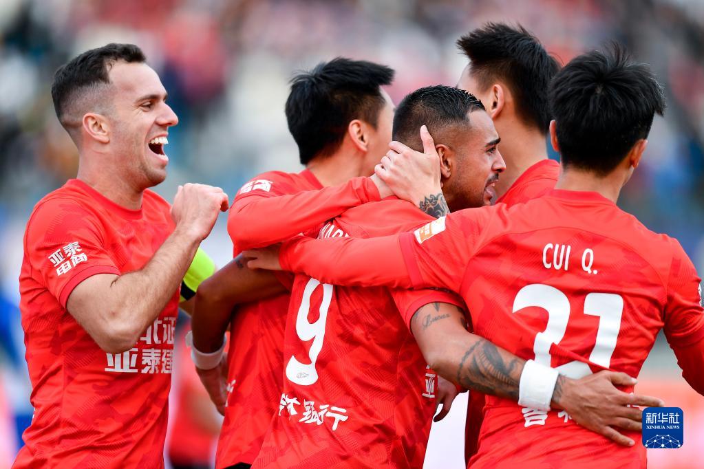 4月30日,长春亚泰队球员莱昂纳多(左三)在比赛中破门得分。