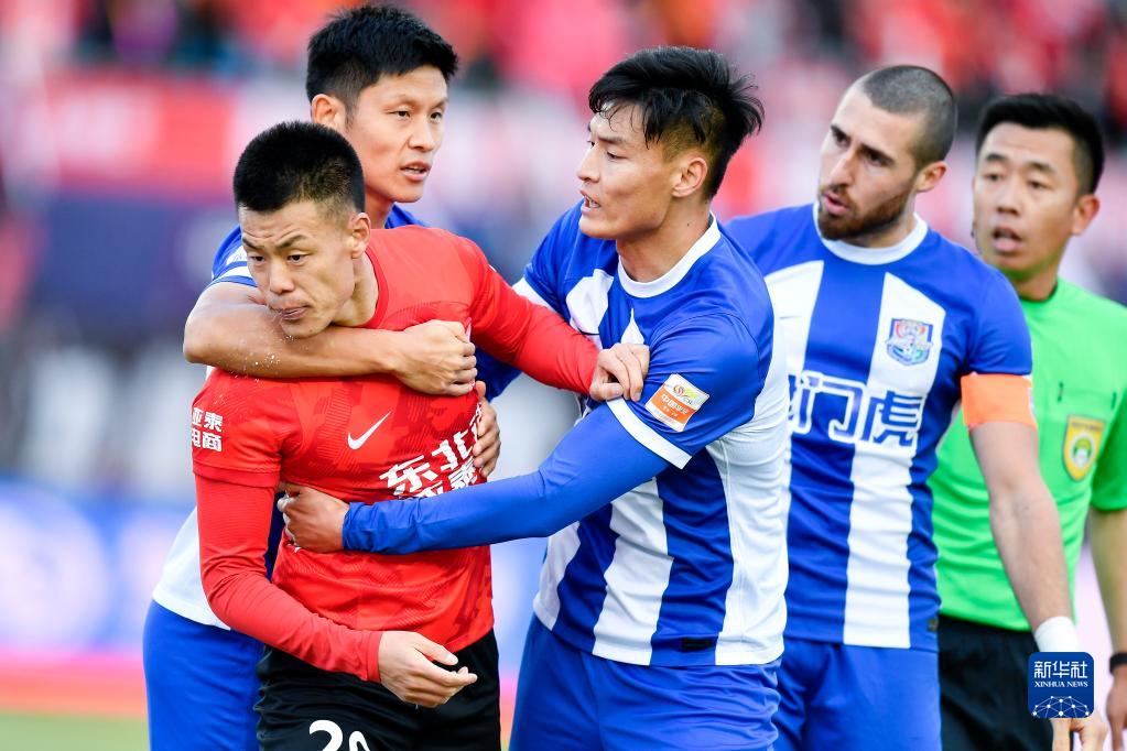 4月30日,长春亚泰队球员谭龙(左一)在比赛中与对手发生争执。