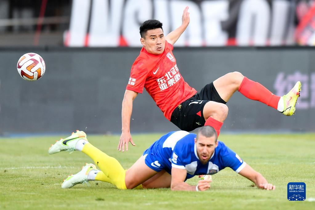 4月30日,长春亚泰队球员程长城(上)在比赛中射门受阻。