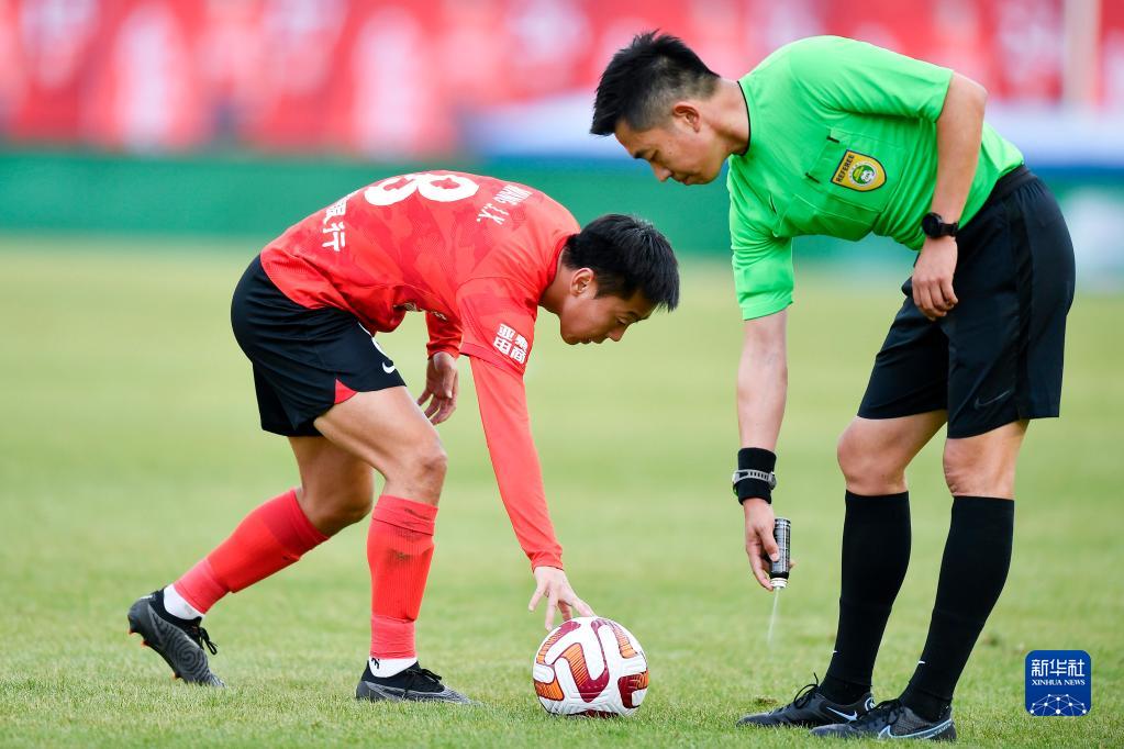 4月30日,主裁判戴弋戈(右)在比赛中标记定位球位置。