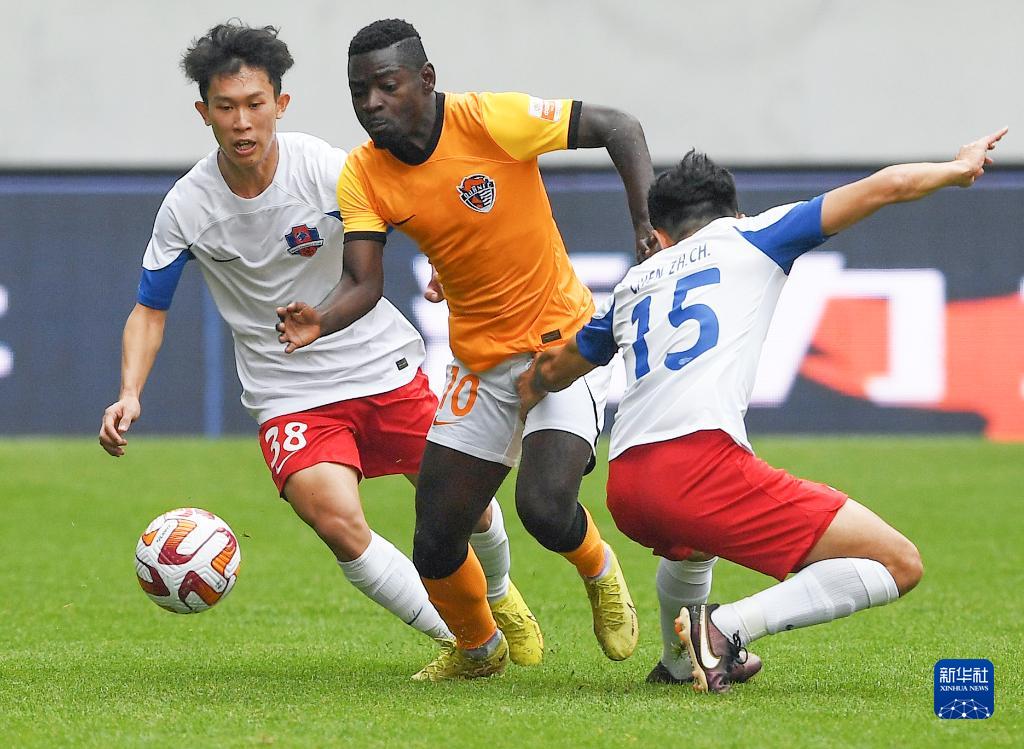 5月14日,梅州客家队球员李永佳(左一)在比赛中防守青岛海牛队球员康瓜的进攻。新华社记者 李紫恒 摄