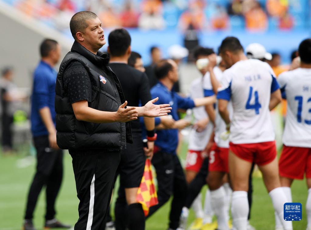 5月14日,梅州客家队主教练米兰(前)在比赛中与球员交流。新华社记者 李紫恒 摄