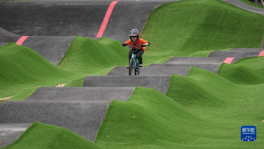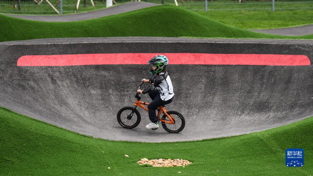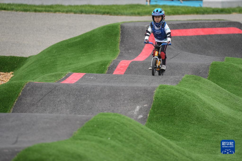 5月27日,一位小朋友在沈阳国际泵道公园内的泵道骑行。新华社记者 潘昱龙 摄