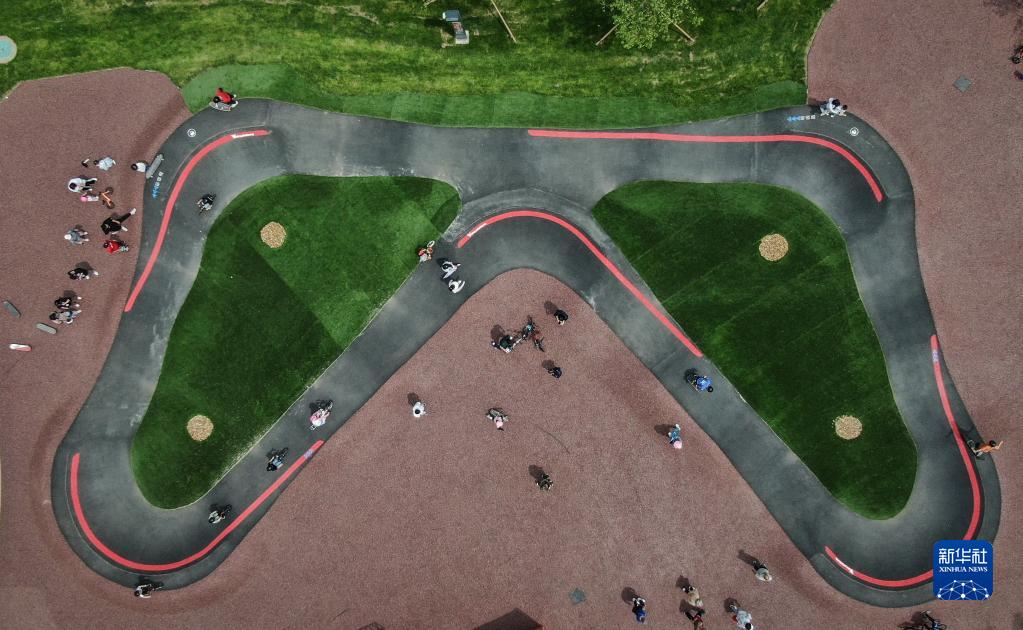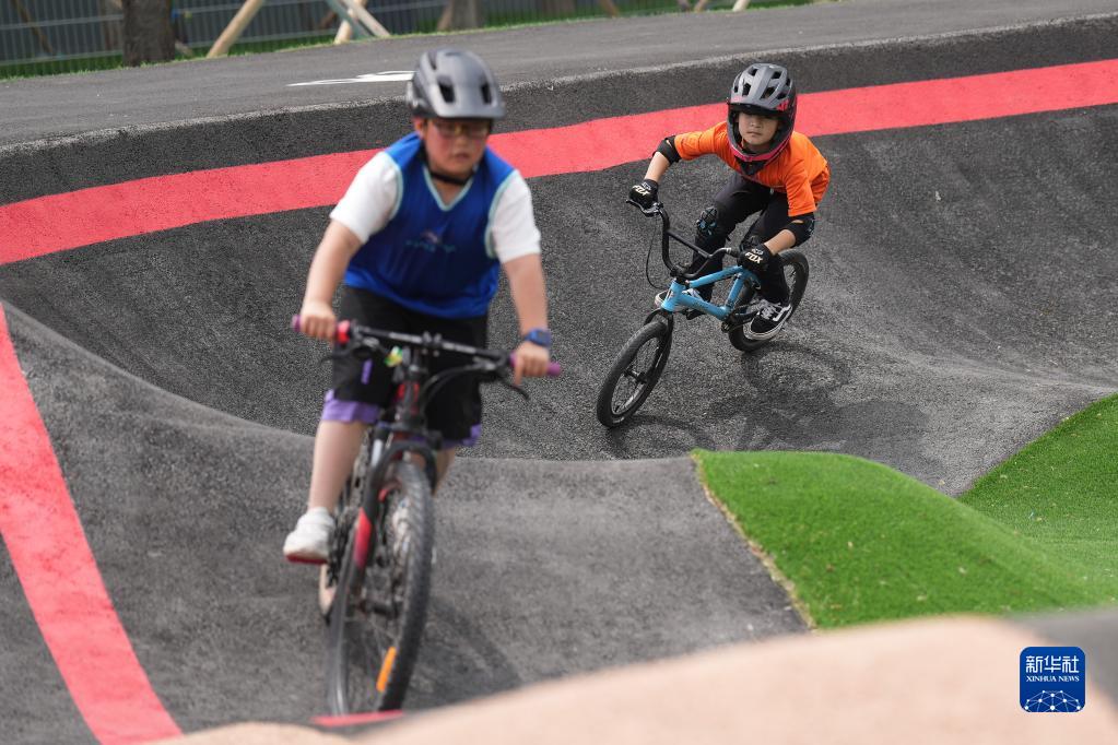 5月27日,小朋友在沈阳国际泵道公园内的泵道骑行。新华社记者 潘昱龙 摄