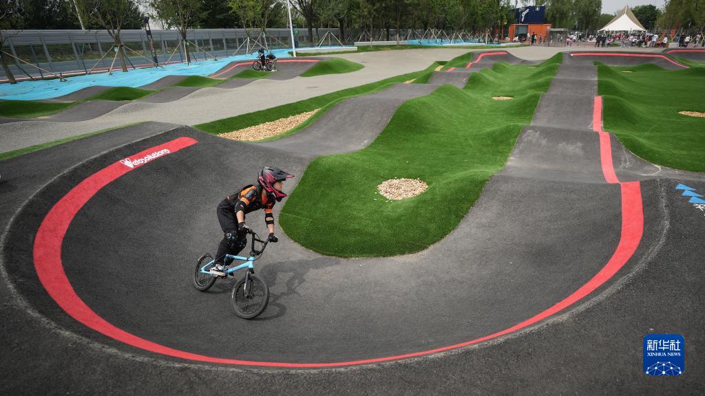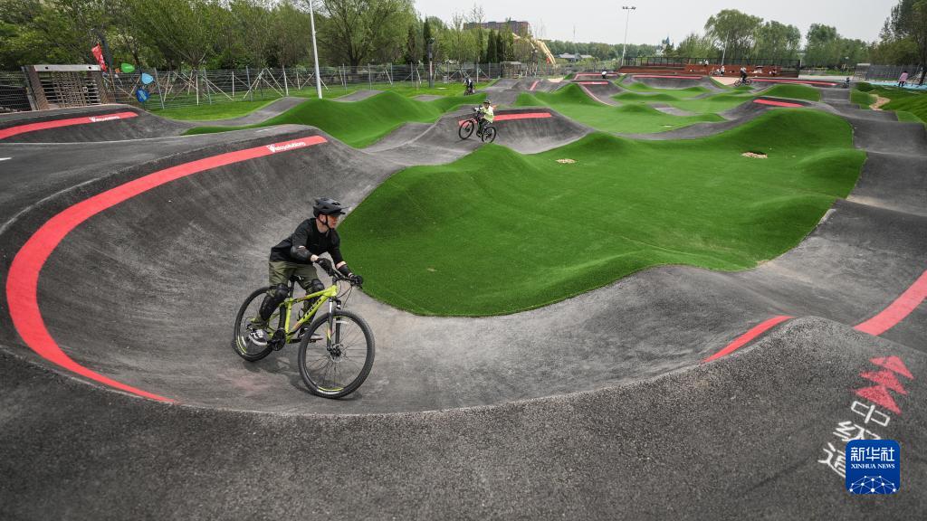 5月27日,骑行爱好者在沈阳国际泵道公园内的泵道骑行。新华社记者 潘昱龙 摄