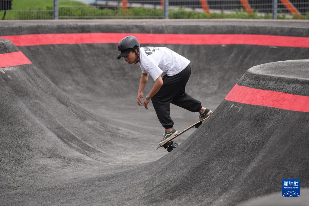 5月27日,一位滑板爱好者在沈阳国际泵道公园内的泵道滑行。新华社记者 潘昱龙 摄