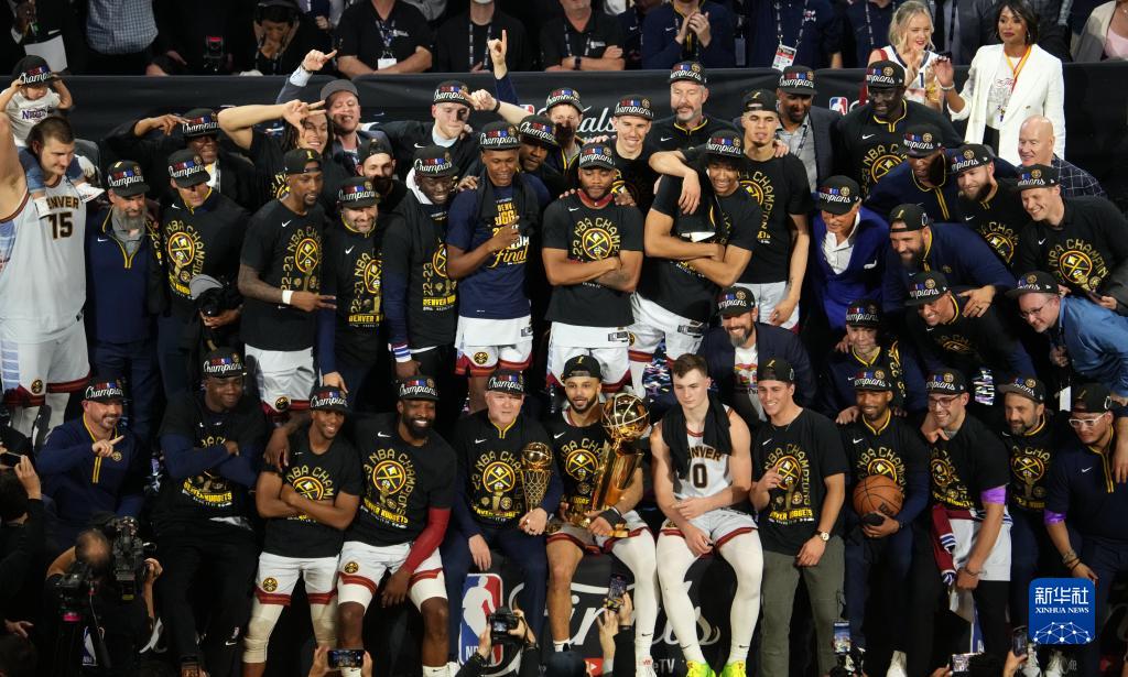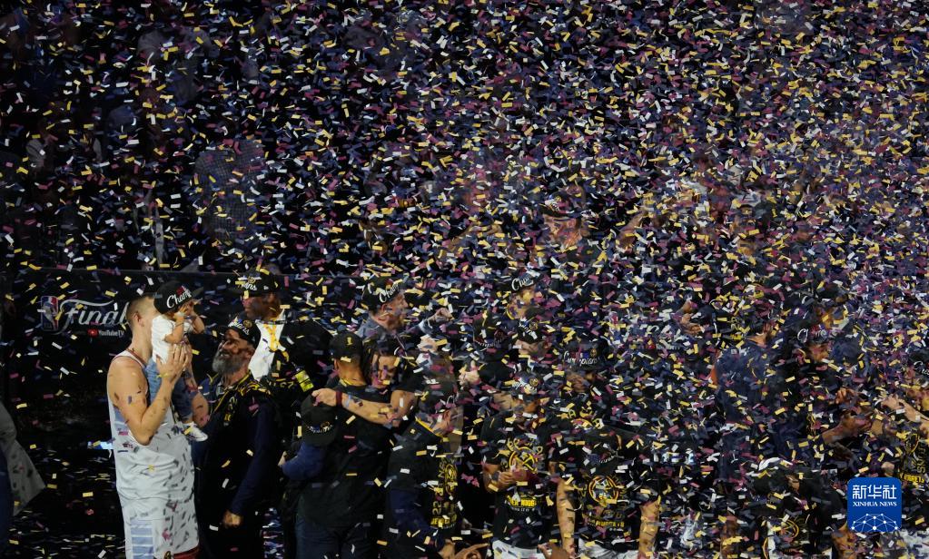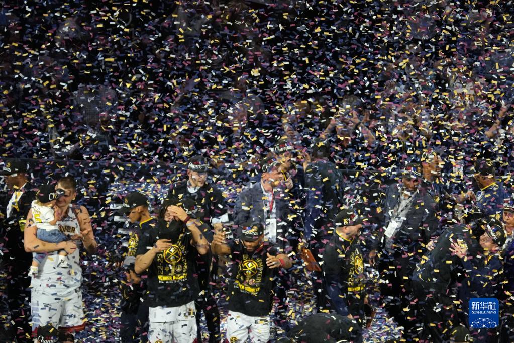 6月12日,丹佛掘金队球员在比赛结束后庆祝夺冠。新华社记者 吴晓凌 摄