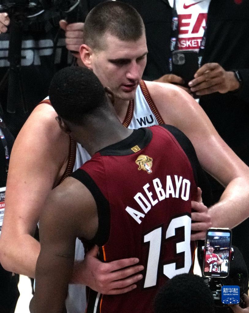 6月12日,丹佛掘金队球员尼古拉·约基奇(后)在比赛结束后与迈阿密热火队球员巴姆·阿德巴约拥抱。新华社记者 吴晓凌 摄