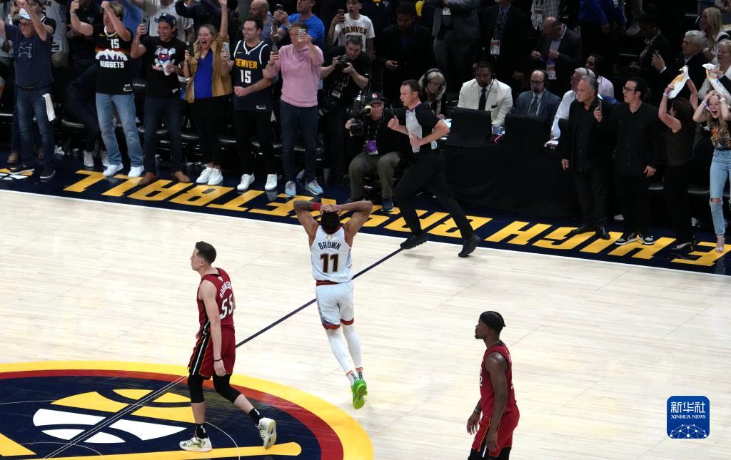 6月12日,丹佛掘金队球员布鲁斯·布朗(中)在比赛结束哨音响起时庆祝夺冠。新华社记者 吴晓凌 摄