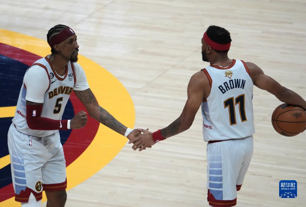 6月12日,丹佛掘金队球员布鲁斯·布朗(右)与队友肯塔维奥斯·考德威尔·波普在比赛中庆祝。新华社记者 吴晓凌 摄