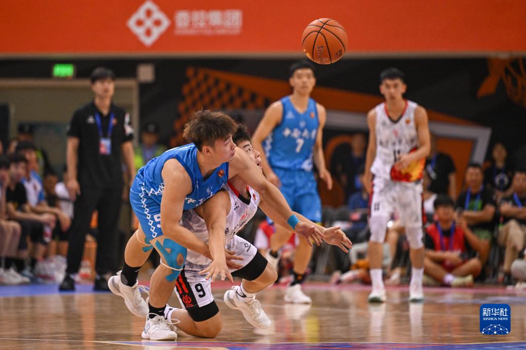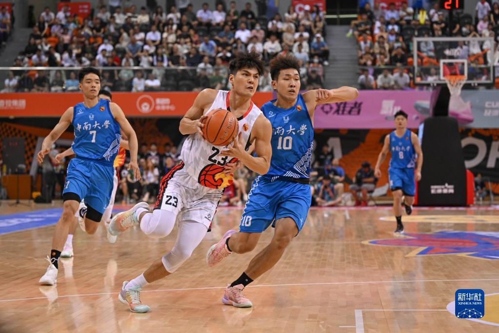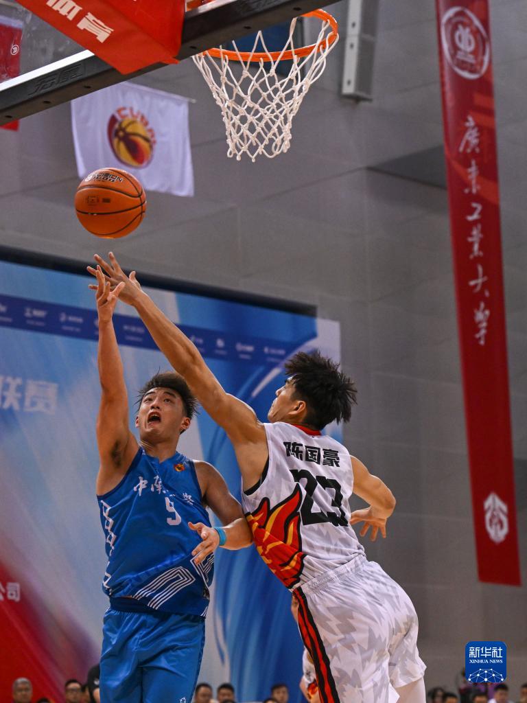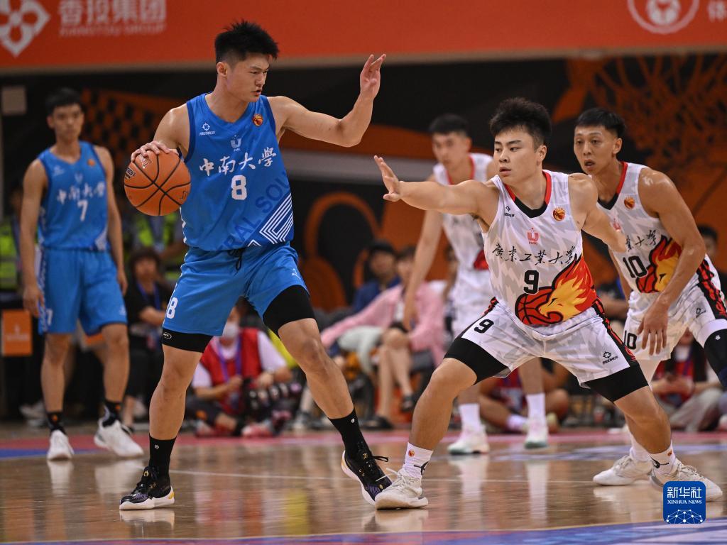 6月16日,广东工业大学队球员陈国豪(右)在比赛中防守中南大学队球员龚思成。新华社记者 胥冰洁 摄