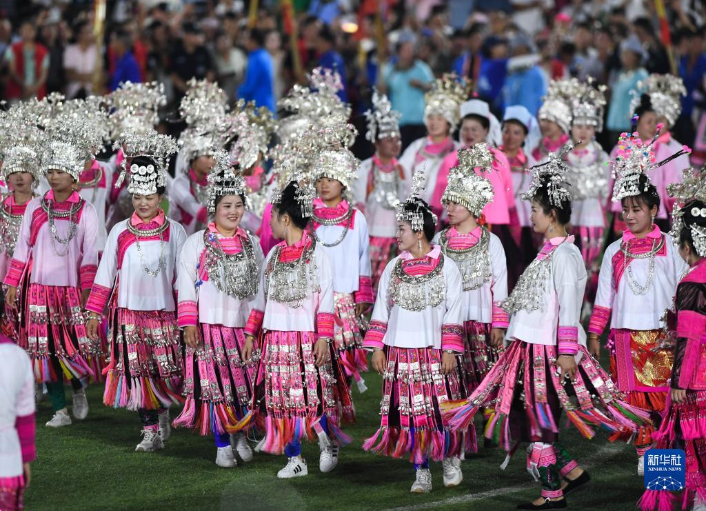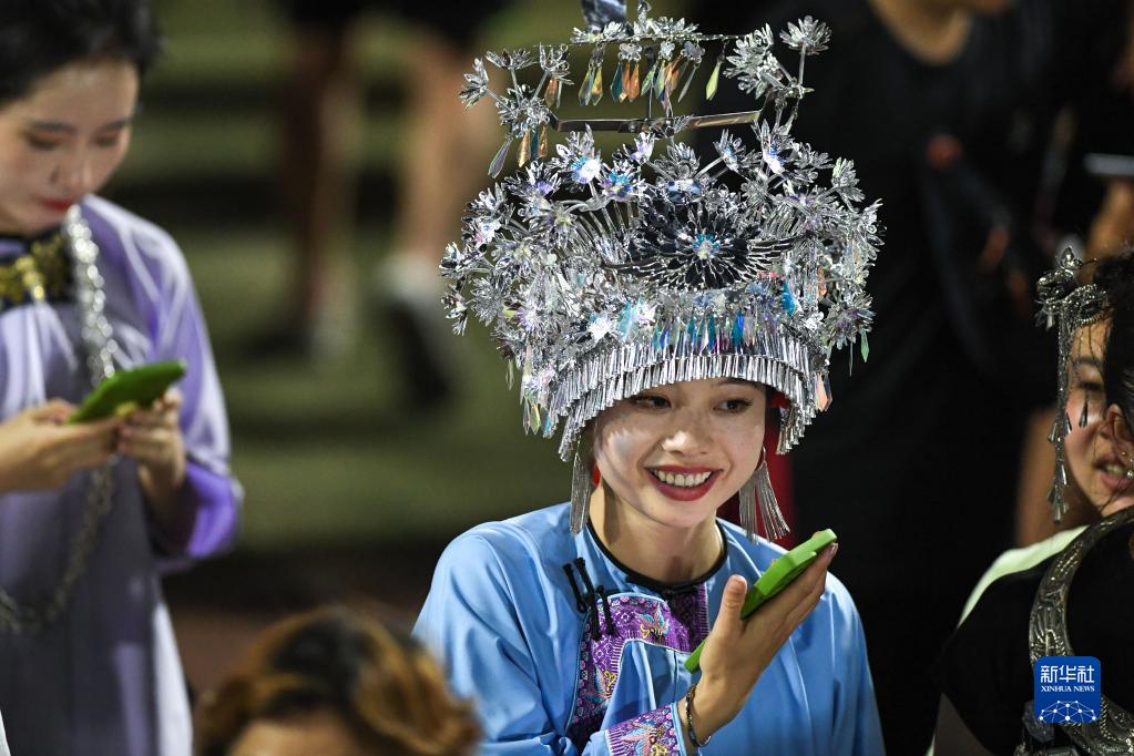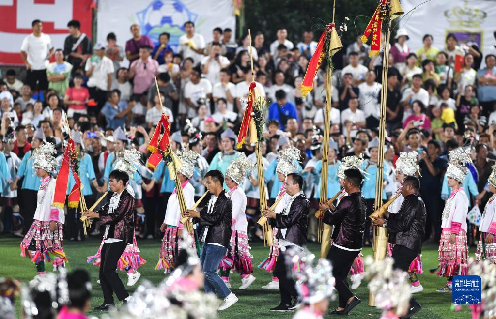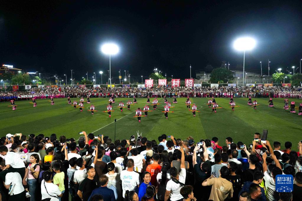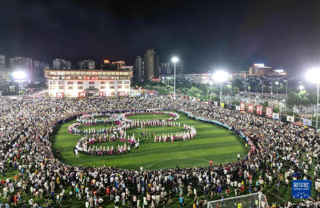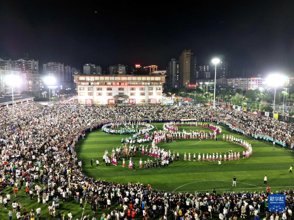 每逢周末,夜幕降临时分,在贵州省黔东南苗族侗族自治州榕江县“村超”比赛现场,村民们在开赛前和中场休息时间,以绿茵场为中心,轮番上场表演侗族琵琶歌、水族芦笙铜鼓舞、瑶族舂杵舞、苗族芦笙舞等民族歌舞和特色乐器,借“村超”的舞台向世人展示当地多姿多彩的民族文化,成为贵州“村超”现场的一大特色。