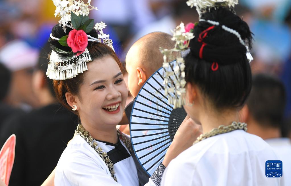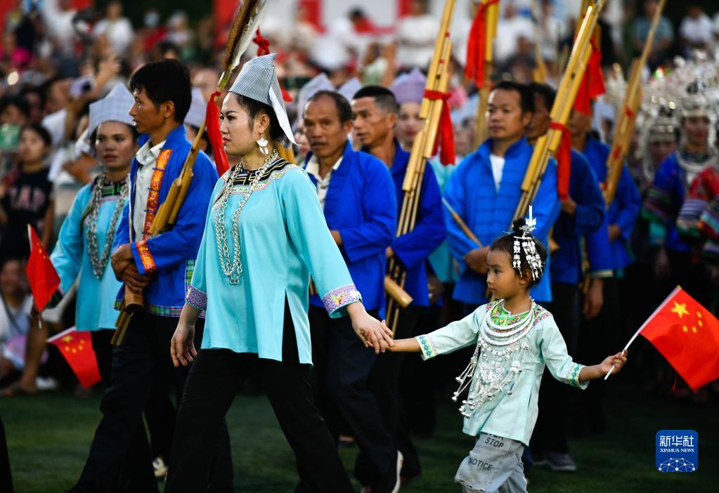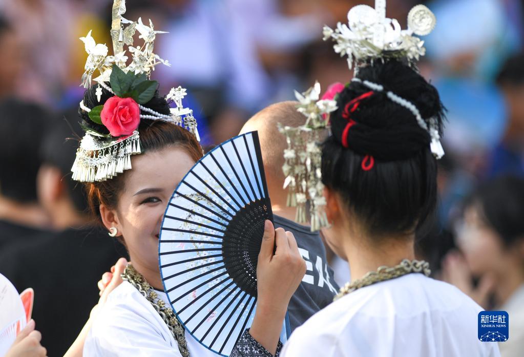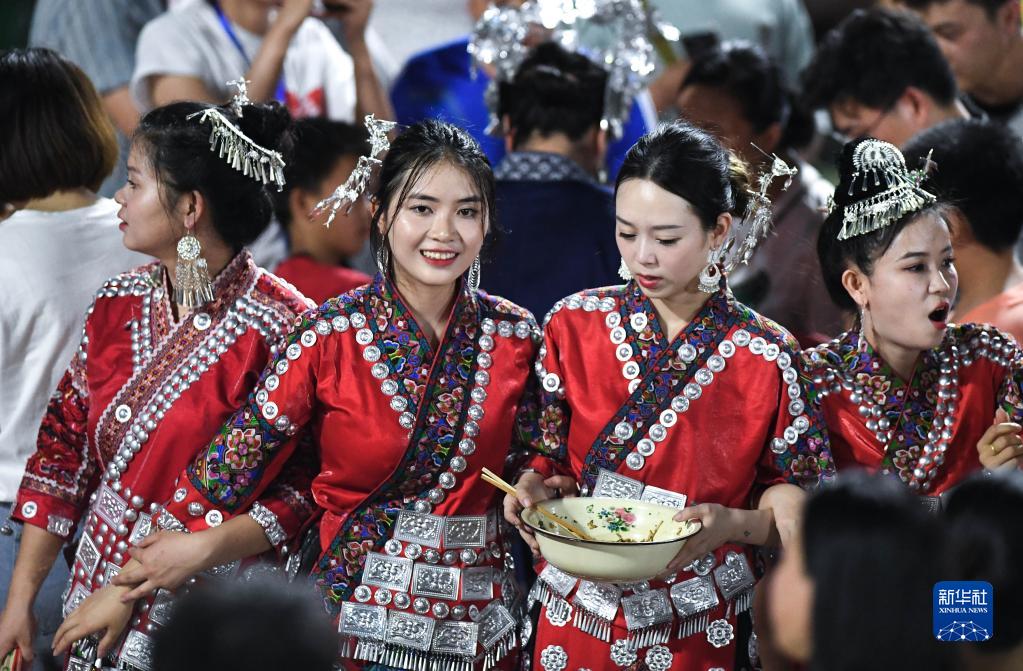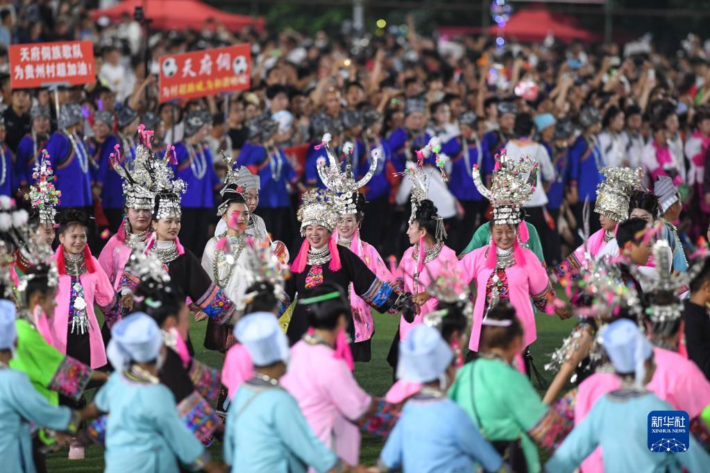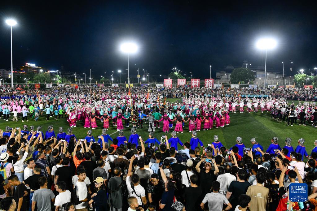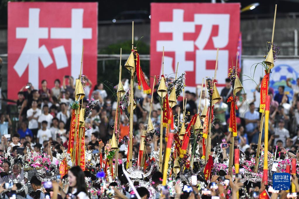 每逢周末,夜幕降临时分,在贵州省黔东南苗族侗族自治州榕江县“村超”比赛现场,村民们在开赛前和中场休息时间,以绿茵场为中心,轮番上场表演侗族琵琶歌、水族芦笙铜鼓舞、瑶族舂杵舞、苗族芦笙舞等民族歌舞和特色乐器,借“村超”的舞台向世人展示当地多姿多彩的民族文化,成为贵州“村超”现场的一大特色。