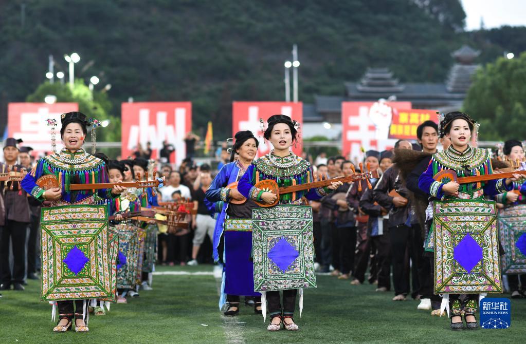 6月17日,在贵州“村超”足球赛开赛前,侗族群众在表演侗寨琵琶歌。新华社发(王炳真摄)
