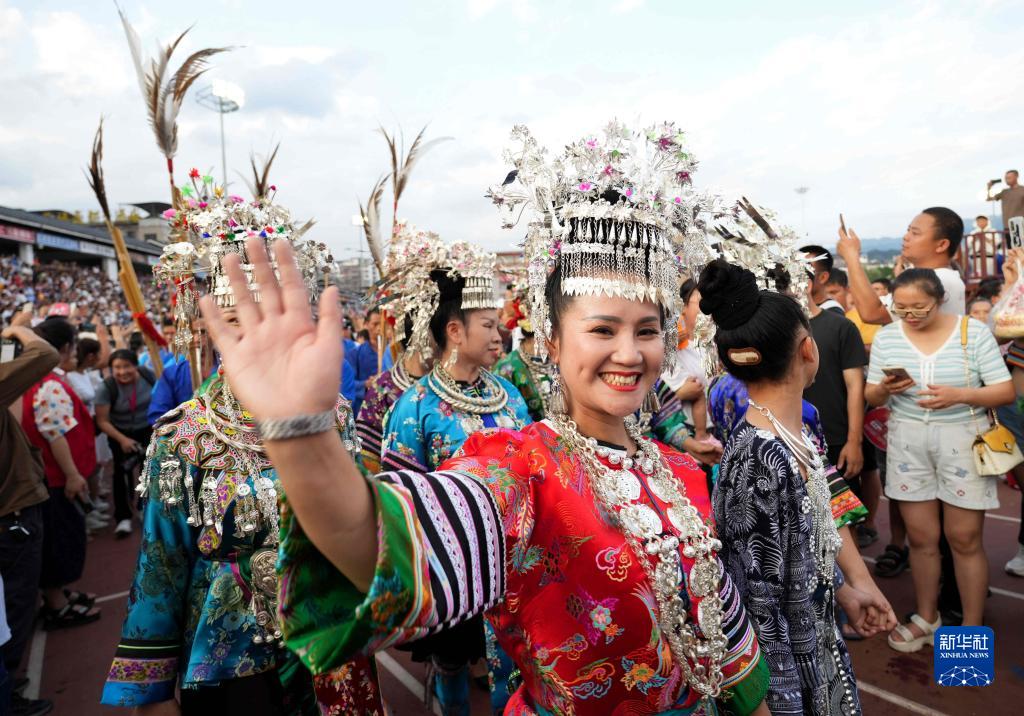 6月17日,在贵州“村超”足球赛开赛前,村民自发组成民族歌舞表演队盛装入场。新华社发(王炳真摄)