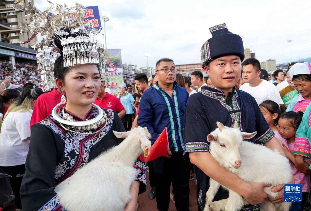 6月17日,在贵州“村超”足球赛开赛前,盛装打扮的村民抱着塔石香羊入场。新华社发(王炳真摄)