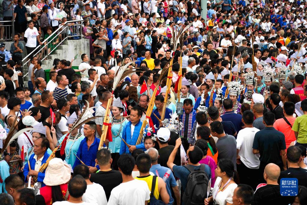6月17日,村民在贵州“村超”足球赛开赛前表演芦笙舞(无人机照片)。新华社发(王炳真摄)