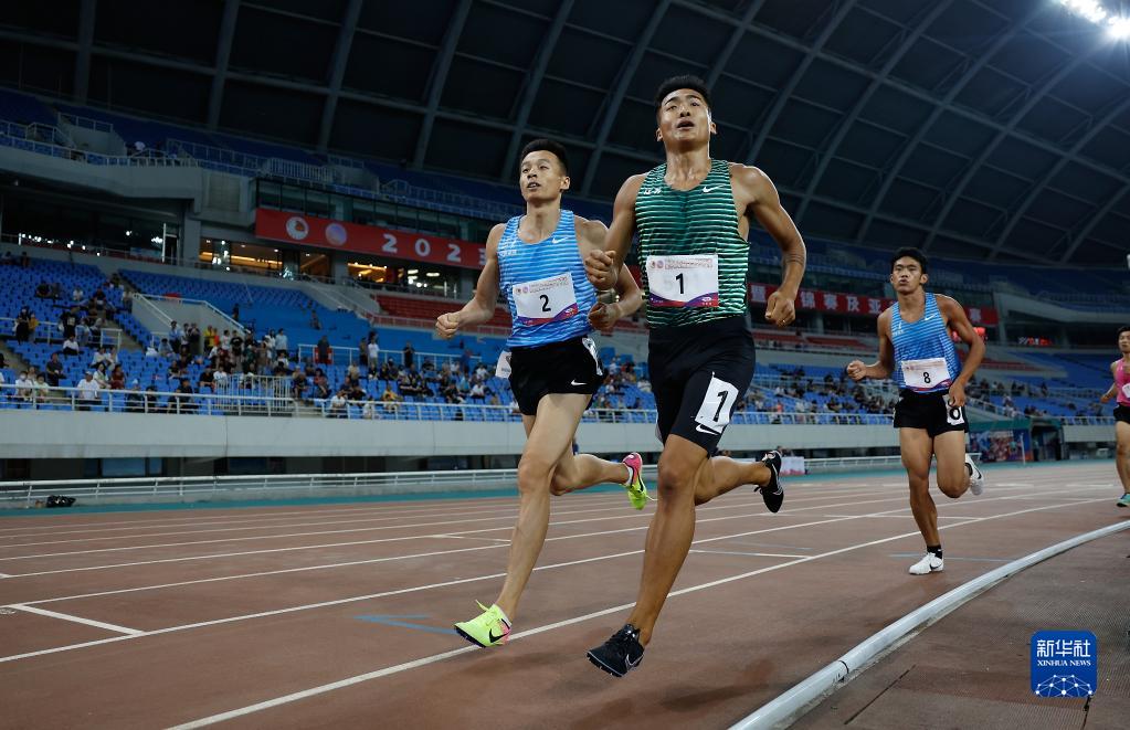6月28日,江苏铁人队选手孙启豪(前右)在男子十项全能最后一项1500米决赛中。最终,他以7852分的总成绩获得男子十项全能冠军。新华社记者 王丽莉 摄