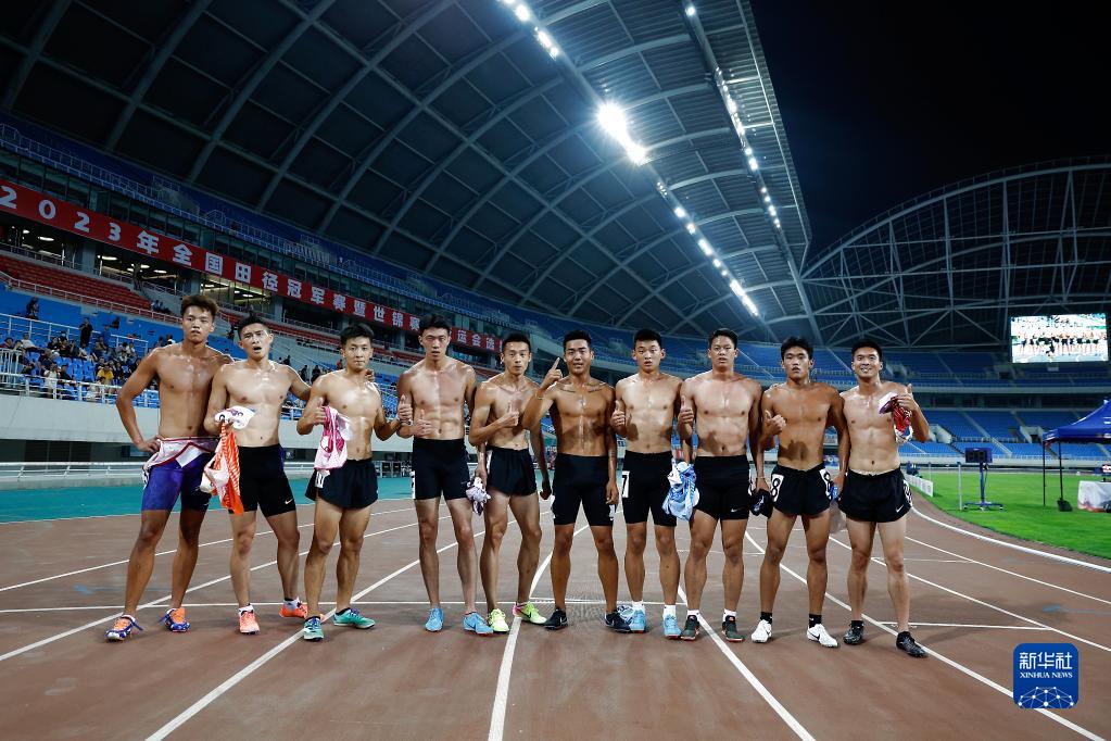 6月28日,选手们在男子十项全能最后一项1500米决赛结束后合影。最终,江苏铁人队选手孙启豪(右五)以7852分的总成绩获得男子十项全能冠军,山东中泰证券队选手宫克威(左五)与吉林队选手陈兴华(左一)分别以7625分与7535分的总成绩获得亚军与季军。新华社记者 王丽莉 摄