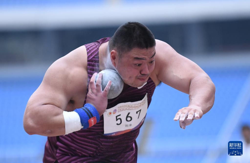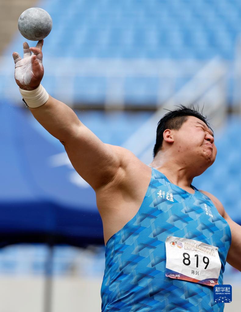 6月29日,新疆零阻力队选手陈剑在男子铅球决赛中。最终,他以19米77的成绩获得亚军。新华社记者 王丽莉 摄
