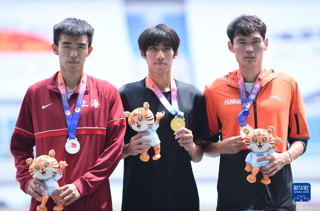 6月29日,冠军广西队选手刘德助(中)、亚军上海队选手谢冬生(左)和季军云南队选手杨国斌在男子800米颁奖仪式上合影。新华社记者 龙雷 摄